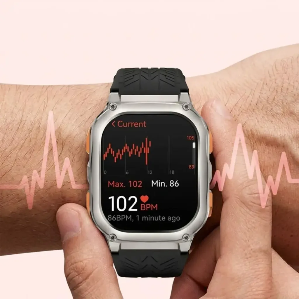 Sensor óptico que permite controlar ritmo cardíaco y nivel de oxígeno en sangre durante todo el día.